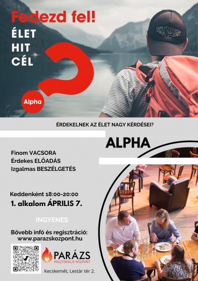 Az Alpha a keresztény hitet felfedező találkozások sorozata. Minden előadás különböző témát jár körül, és megalapozza az azt követő kiscsoportos beszélgetést. Az Alpha világszerte jelen van: kávézókban, templomokban, egyetemeken, otthonokban. Nincs két egyforma Alpha, mégis három közös vonásuk van: vendéglátás, előadás és jóhangulatú kiscsoportos beszélgetés.