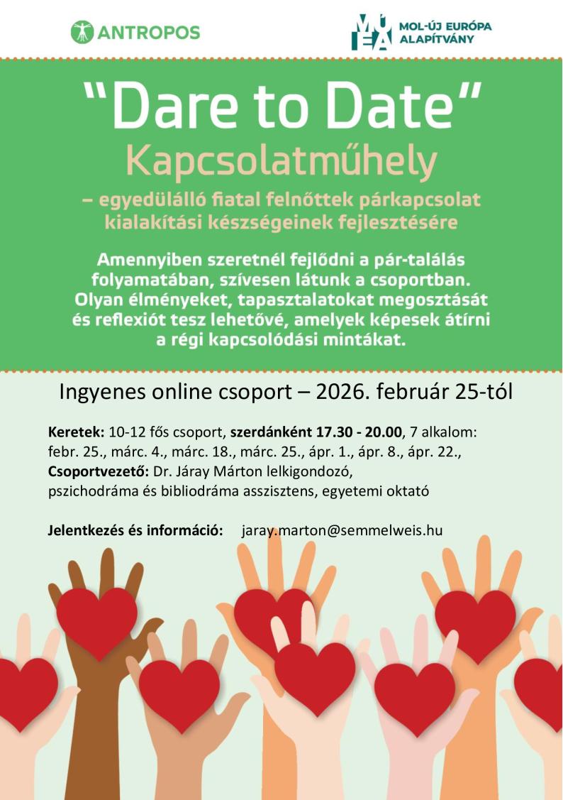 A csoport 7 alkalomból áll: 2026. febr. 25., márc. 4., márc. 18., márc. 25., ápr. 1., ápr. 8., ápr. 22. szerdánként 17.30-20.00-ig.