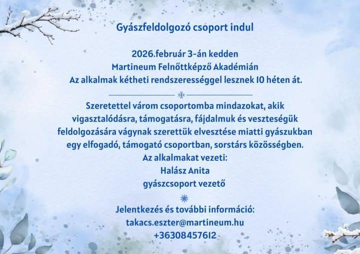 Szeretettel várjuk a jelentkezőket a februárban induló gyászfeldolgozó csoportba és egyéni konzultációra is! A csoportfoglalkozás első alkalma 2026. február 3. 17.30.
