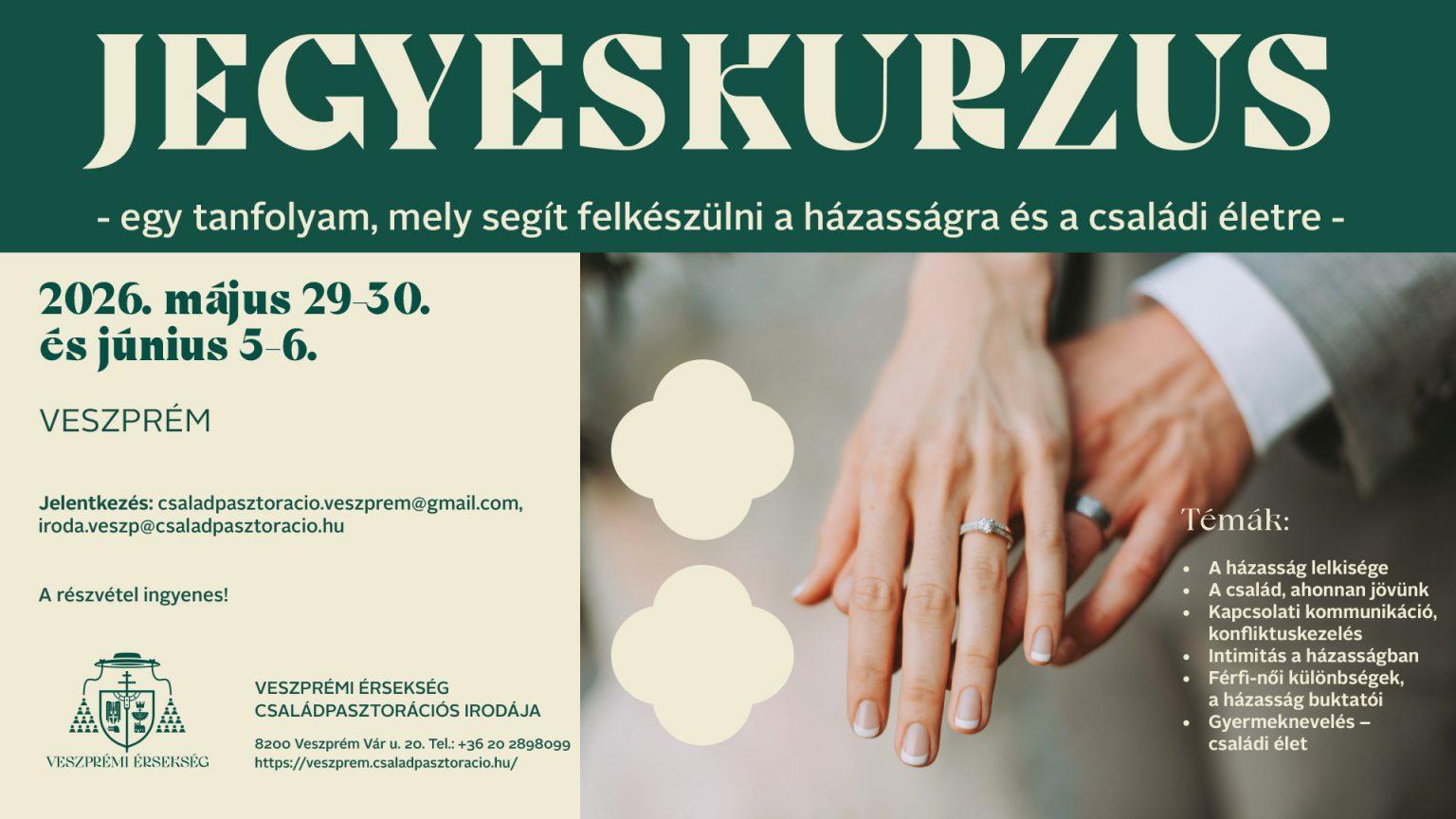 Jegyeskurzus alkalmai 2026. május 29-30. és június 5-6. napjain Veszprémben kerülnek megtartásra. A pénteki előadások napjai 18.00-20.00 óráig tartanak, szombatonként 14.00-17.00 óráig tartanak az alkalmak.