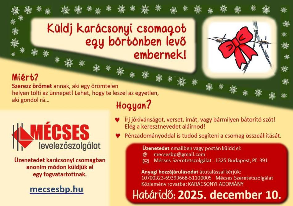 Ha adománnyal támogatnád az akciót, azt is megköszönjük, hiszen a csomagok a Mécses számára pénzbe kerülnek.