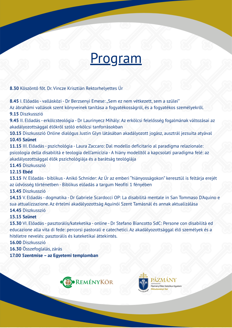 A "Paradigmaváltások az akadályozottsággal élő személyekről szóló katolikus tanításban" konferencián három olasz, egy ausztrál és három magyar nyelvű teológus részvételével vizsgáljuk, hogyan alakult a fogyatékosság/fogyatékossággal élő ember teológiai értelmezése összehasonlító valláskutató, biblikus, antropológiai, dogmatikus, erkölcsteológiai és pasztorális szempontból.
