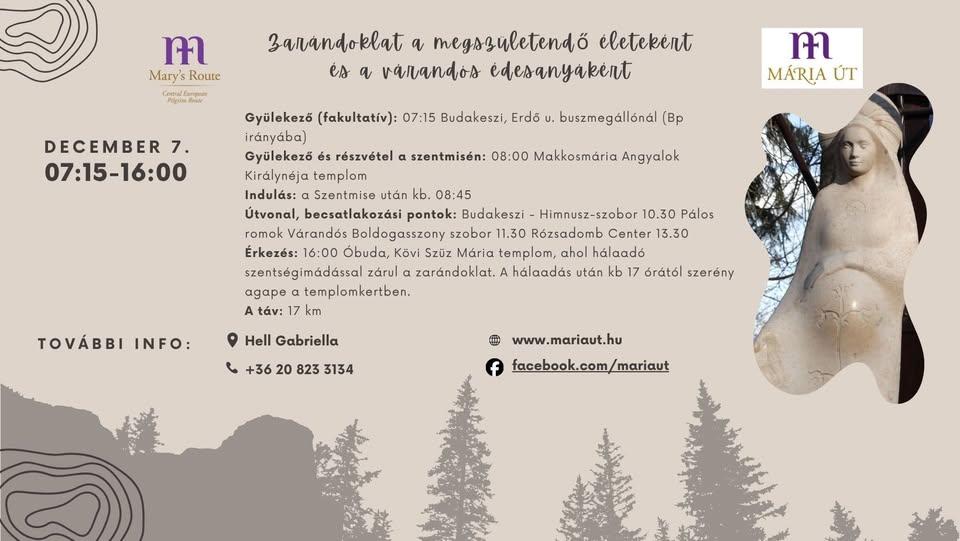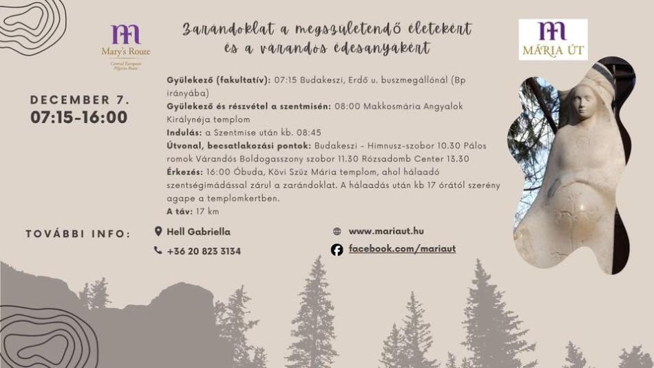 Érkezés: 16:00 Óbuda, Kövi Szüz Mária templom, ahol hálaadó szentségimádással zárul a zarándoklat. A hálaadás után kb 17 órától szerény agape a templomkertben.